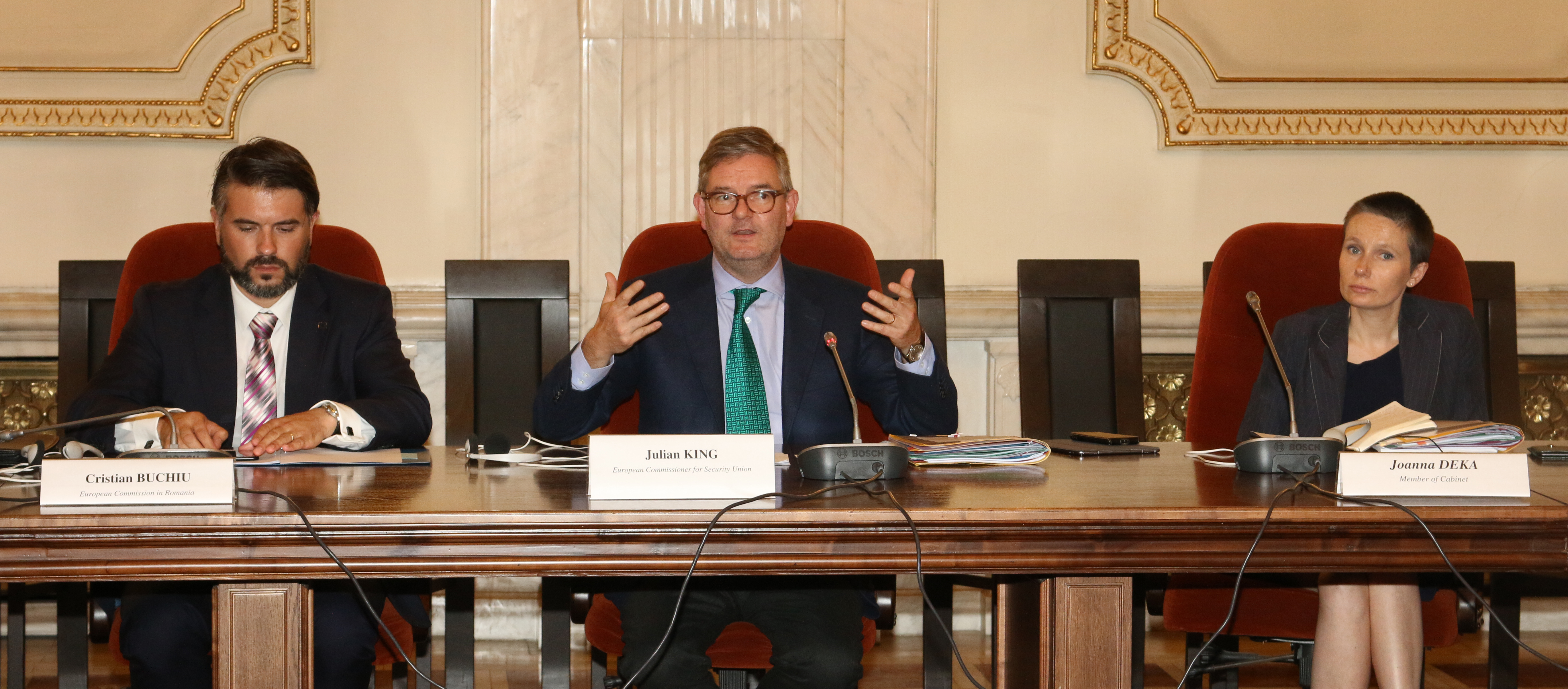 În cadrul vizitei de lucru pe care a efectuat-o în România, luni, 18 septembrie 2017, Comisarul european responsabil pentru Uniunea securităţii, Julian King, a avut o întrevedere cu comisiile parlamentare reunite ale Senatului şi Camerei Deputaţilor pentru afaceri europene și pentru apărare, ordine publică și siguranță națională.