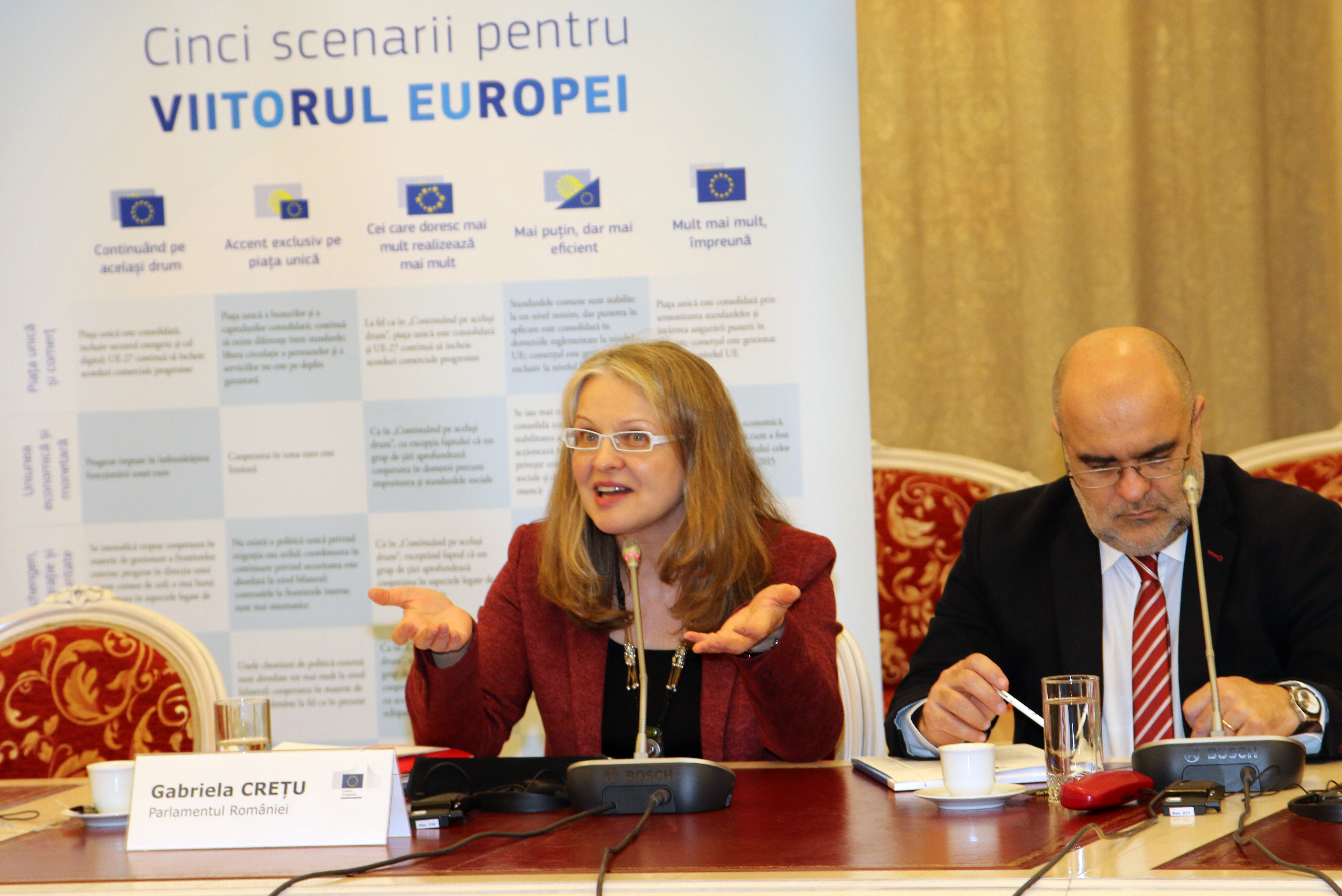 În alocuțiunea sa, doamna Gabriela Crețu, președinta Comisiei pentru afaceri europene din Senatul României a subliniat faptul că Brexitul trebuie considerat ca o oportunitate de a ne reierarhiza prioritățile europene și de a găsi mijloacele adecvate de a le aduce până la îndeplinire. Resursele proprii ale UE sunt relativ reduse, cea mai mare parte a lor venind din contribuțiile raportate la produsul intern al statelor membre. Aici însă perspectiva este una profundă, deoarece raportul contribuții / beneficii nu este unul strict contabil. Deși există o balanță între contribuții și atragerea de fonduri, să nu uităm că cea mai mare realizare de până acum a UE este piața unică. Aici, unele state membre au mai multe avantaje nete decât contribuția contabilă la bugetul comun. Există, de asemenea, pe lângă multe bunuri tangibile, și o mulțime de lucruri pe care ni le dorim, dar doar împreună le putem atinge, ca securitatea, pacea, libera circulație. Doar o reformă progresistă ce presupune alocarea de fonduri pentru funcția de stabilizare, pentru crearea de bunuri publice europene pe care UE să le furnizeze cetățenilor, poate întări legăturile între ei și crește din nou încrederea acestora în Uniune.